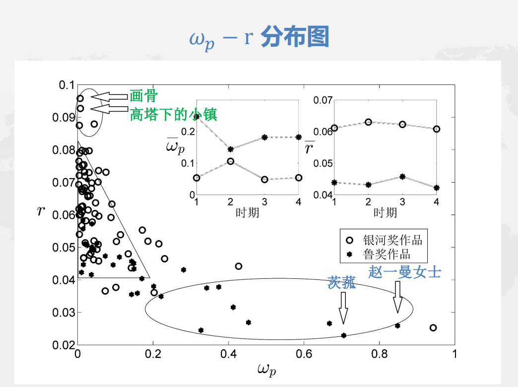 刘洋老师在接下来的研究中选取了1986年至2017年历届鲁迅文学奖和银河奖代表作品分别作为主流文学小说和科幻小说的样本,采用上述算法进行对照分析,得出主流文学小说和科幻小说的最大峰值频率(ωp)-展示度(r)分布图(如图5)。