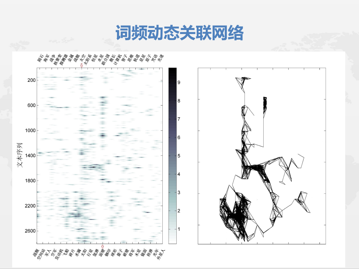 上图是《三体2》的关联词频时序图,其中文本序列是以500字为一个单位人为划分的,图像上的点颜色越深,代表关键词在该处出现的次数越多。图中,“太空”和“面壁”呈纵向连续分布,说明这两个关键词在各板块都高频出现。同时,在图6中,纵坐标1400-1800的范围内图像呈从左上向右下延伸的斜线,表明叙述重心由“面壁”向“钢印”“量子”等关键词转移。