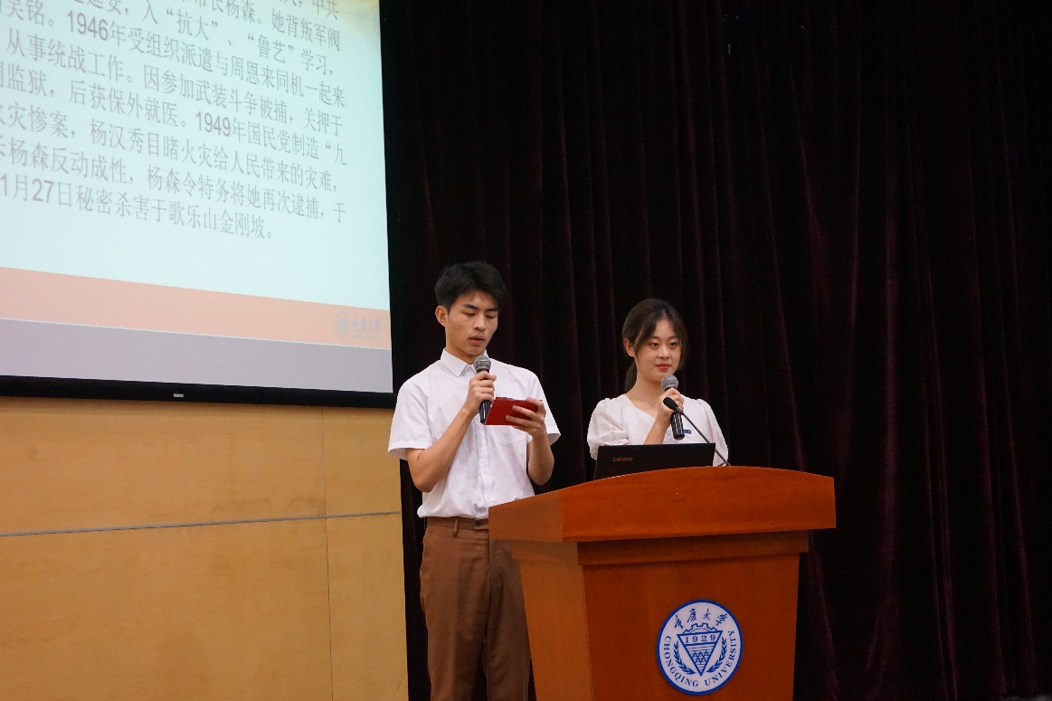 来自美视电影学院的八位巡讲员两人一组,轮番登台。分别从《毛泽东重庆谈判的故事》《漆鲁鱼:万里寻党》《杨汉秀:卓节流芳播海瀛》和《刘伯承——意志如钢的军神》四个主题出发,讲述革命先辈令人动容的红色故事。伴随着庄严的配乐,巡讲员们语调时而激昂,时而低沉,将故事娓娓道来,用语言还原历史场景,展现人物革命精神。在历史转折关头,毛泽东为了国家的前途和人民的利益,置个人安危于不顾,深入虎穴,以身犯险,体现了革命领袖始终牢记为人民谋幸福、为民族谋复兴的初心使命。漆鲁鱼不畏艰辛,万里寻党,他曾说:“不要坐等党组织来找自己,只有自己行动起来,才能回到党的怀抱。”杨汉秀为了党和人民的事业,舍弃了安逸的生活,牺牲了自己的一切,直至献出了生命,“归来遭遇鸱枭辈,卓节流芳播海瀛”是对其高尚人格的书写。刘伯承意志如钢铁一般,手术拒绝麻醉,72刀见证“军神”的诞生……他们的事迹令人钦佩,其精神感染着在场的每一位师生。