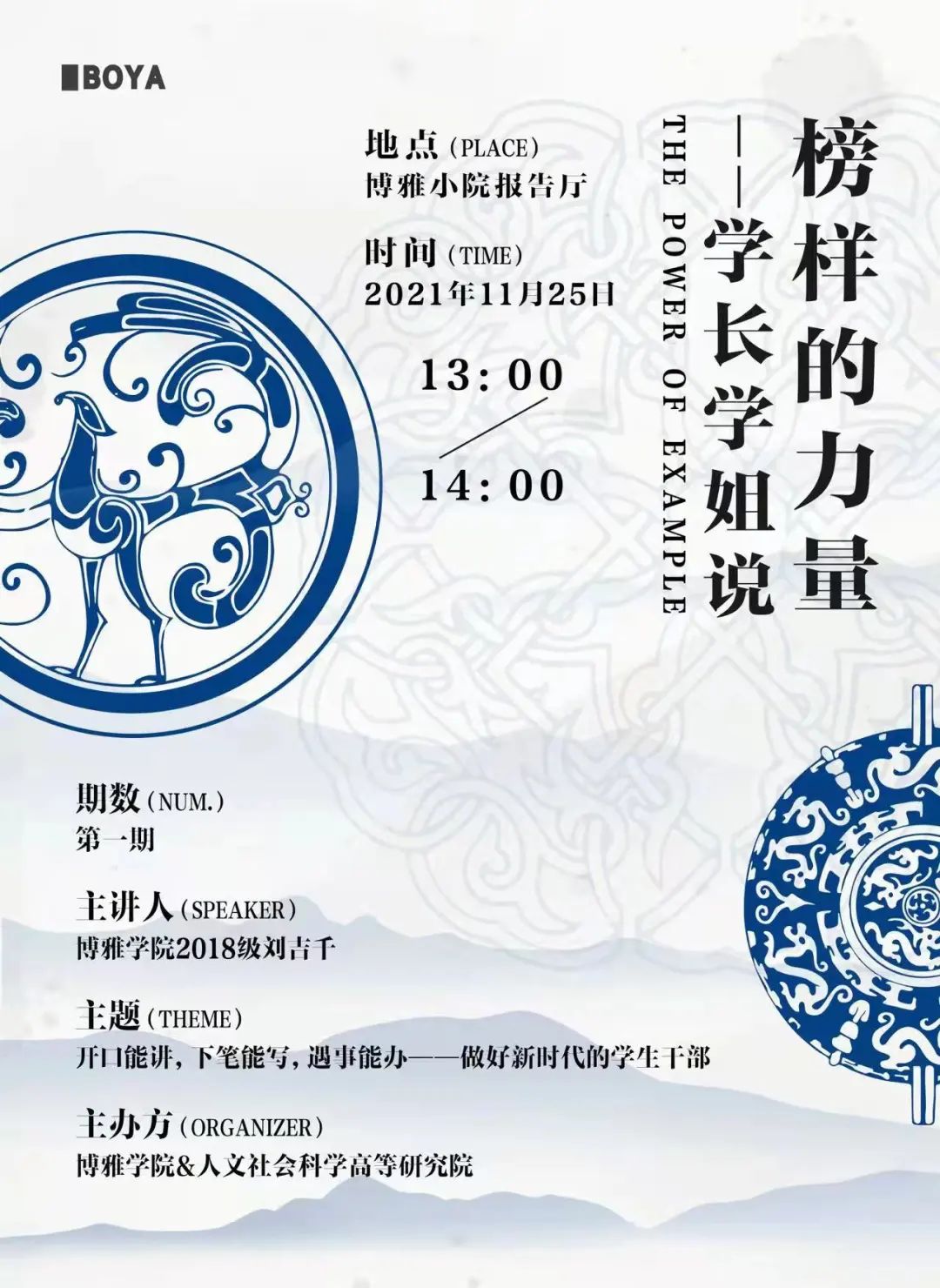 11月25日13时至14时,由学生会组织的“榜样的力量--学长学姐说”第一期活动将在博雅小院报告厅正式举行。