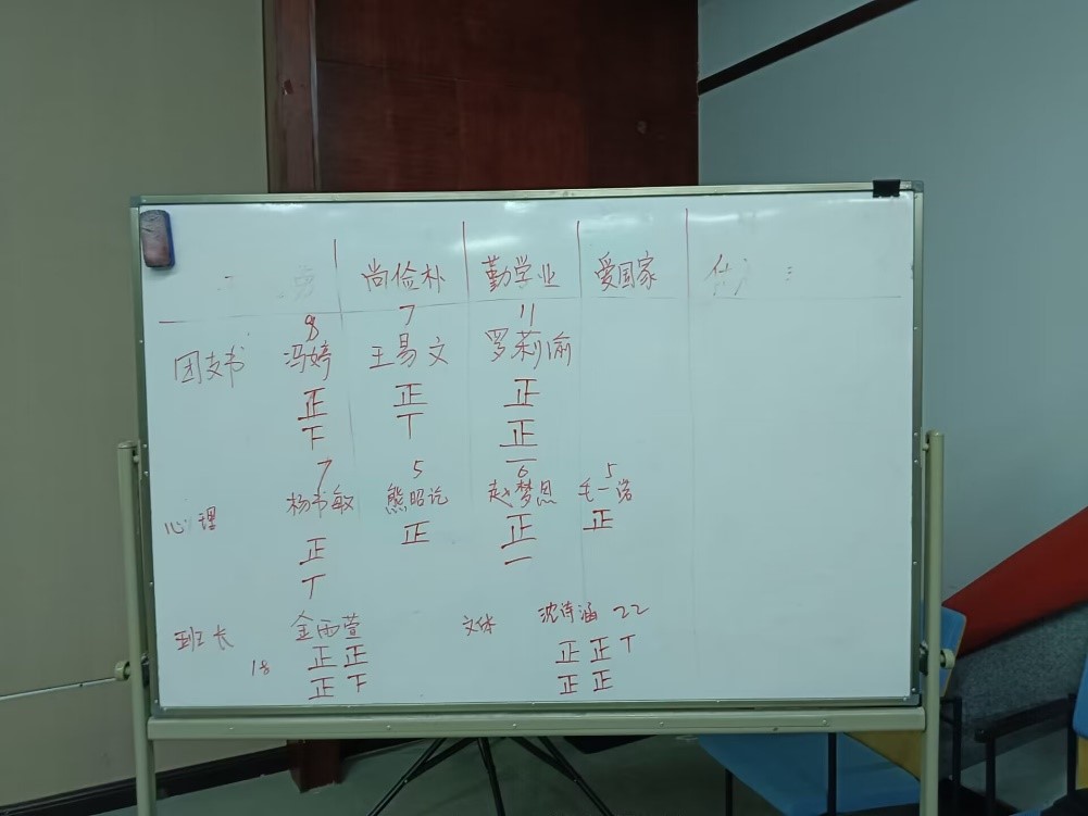 随后,班会举行了第一学年的班委选举。通过现场提名、自我推荐、民主投票等环节,同学们选举产生了新一届班委,金雨萱、罗莉渝、沈诗涵、杨书敏四位同学分别当选班长、团支书、文体委员和心理委员。新一届的班委将在新学年做好班级的事务管理工作,帮助同学们过上更加有序、充实的大学生活。