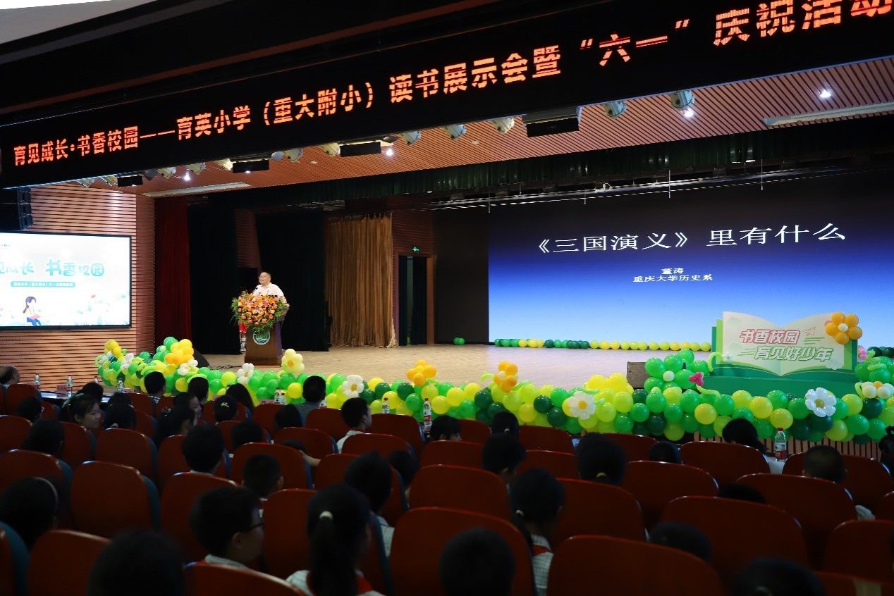 在育英小学大礼堂,董涛老师以《三国演义》为例,向现场500余名小学生们分享了如何阅读经典名著。他指出,《三国演义》通过赋予具体形象更加鲜明的特征和更为深厚的意蕴,传达了历史人物的家国情怀。要从《三国演义》中认识中华民族数千年悠久辉煌的历史,从文学想象和历史地理中深刻把握中华文明的人文特征与历史进程,体悟优秀传统文化的内涵和中华民族精神的底色。他还与育英小学6名学生就《三国演义》中的内容进行对谈,同学们表达对书中人物、书中所述历史事件的困惑,董涛老师对其进行一一澄清,并鼓励同学们通过辩证的方法来解读书中人物故事。他强调,人文素养的积累是学生获得学术能力纵深发展的重要基础,而经典阅读也将在新时代加强基础文科建设和中小学文化教育方面发挥愈发重要的作用,鼓励学生以经典出发,以史为鉴,从传统文化中汲取精神养分。