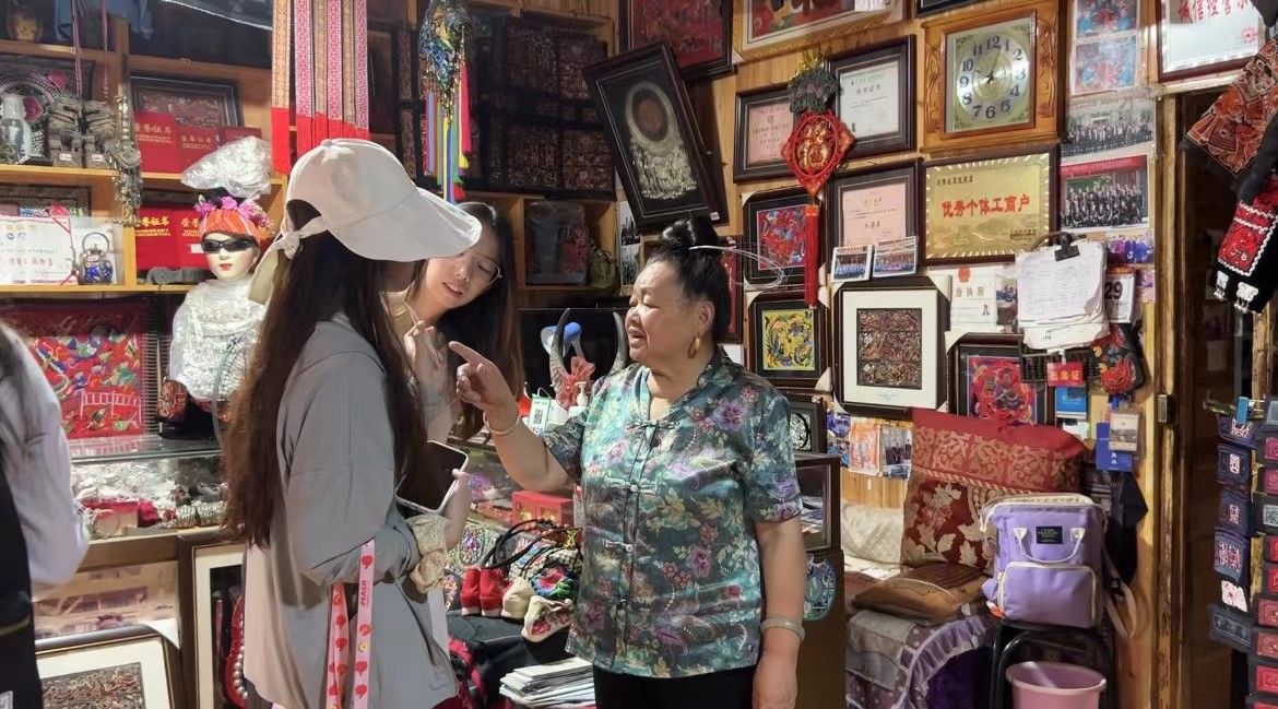 6月30日上午,各小组借赶集日外出进行调研。在调研过程中,银饰小组在银匠吴国政的摊位开展实践,了解银饰品制作知识;布料小组在制布摊位观察制布过程中染布操作;头饰小组参观摊主头饰制作过程;其他考察小组则对集市路线进行实地考察。