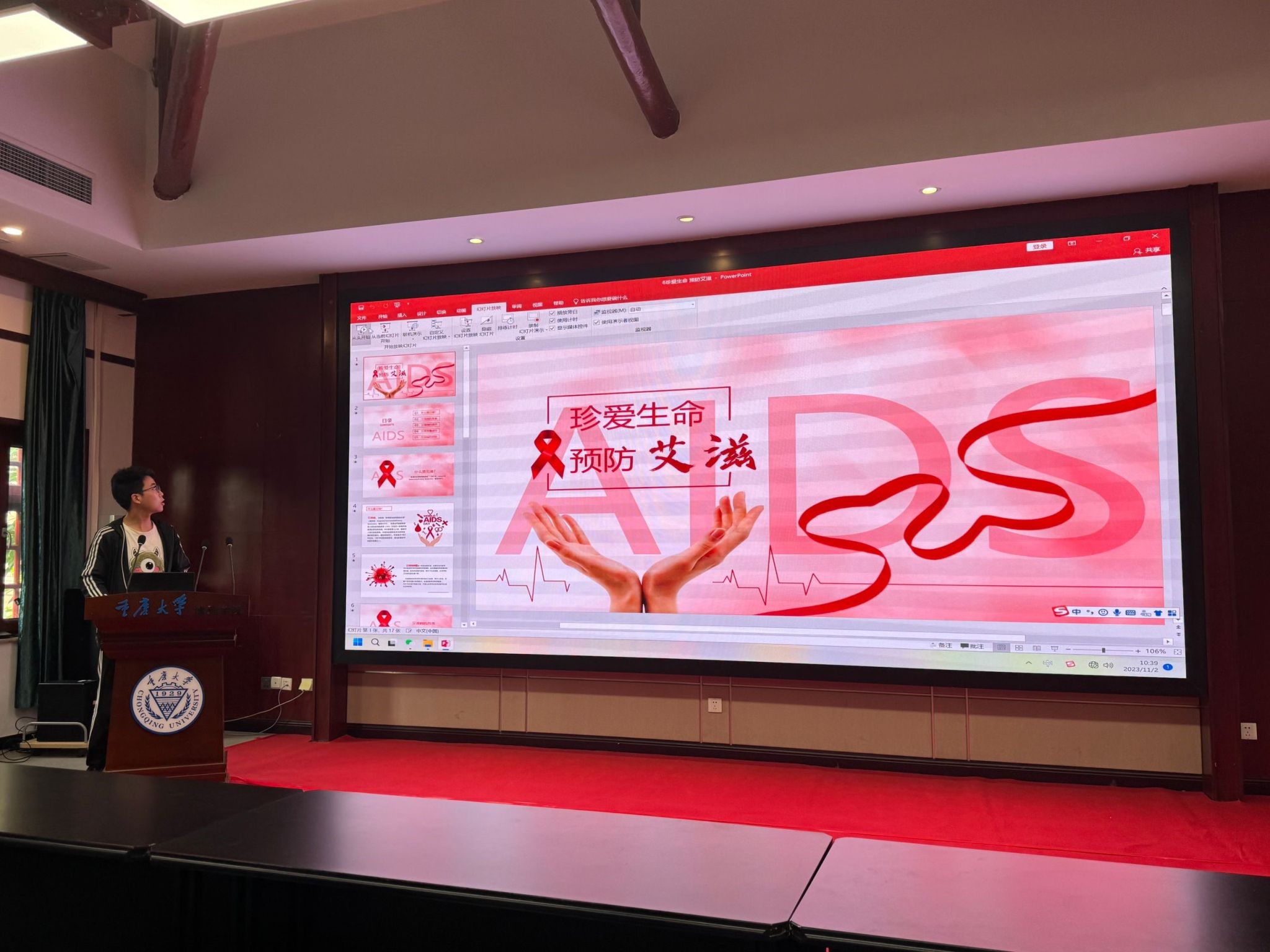 2023级本科生于10月19日在博雅书院报告厅开展以“爱青春,远离‘艾’”为主题的主题班会活动。本次主题班会由班长侯佳莹、刘思源共同主持,2023级班主任赵耀文、罗勇出席,2023级全体本科生参加本次活动。