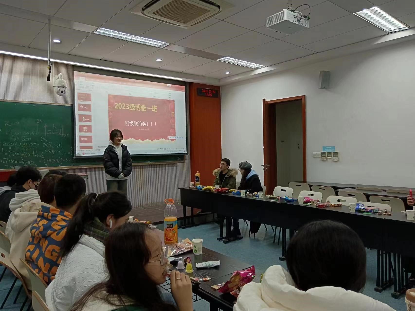 2023级1班在A8301开展了以“辞旧岁,迎新年”为主题的班会。任课老师吴娇、张帆、何祥迪和班主任赵耀文参加了本次活动。