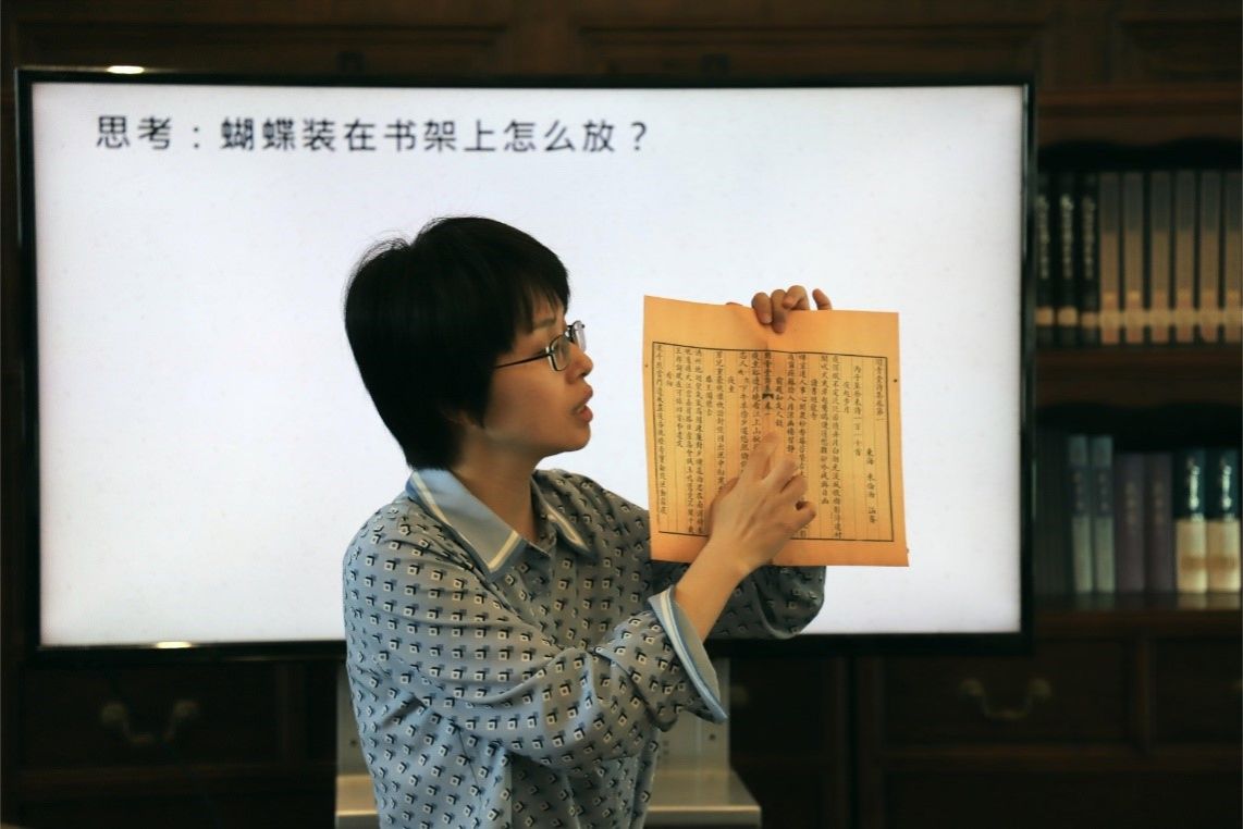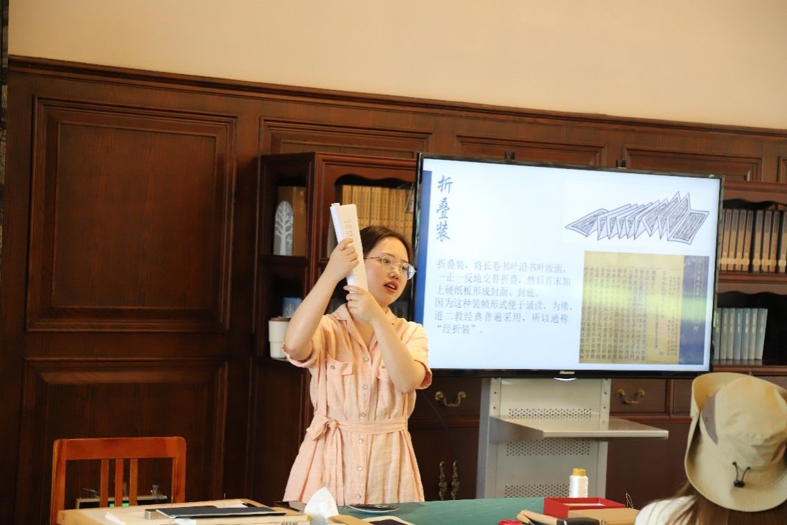 活动伊始,特藏部李丽老师向大家介绍了古典文献载体的演变简史,然后概述了纸质文献的装帧形式,如卷轴装、经折装、蝴蝶装、线装等。每一种装帧形式背后都承载着特定时代的文化风格与实用需求。