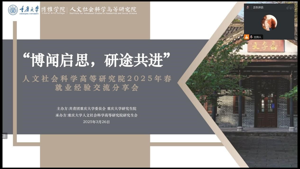 研究生的职业素养与就业竞争力,助力同学们更好地规划职业生涯,2025年3月26日,人文社会科学高等研究院举办了“博闻启思,研途共进”就业经验交流分享会。