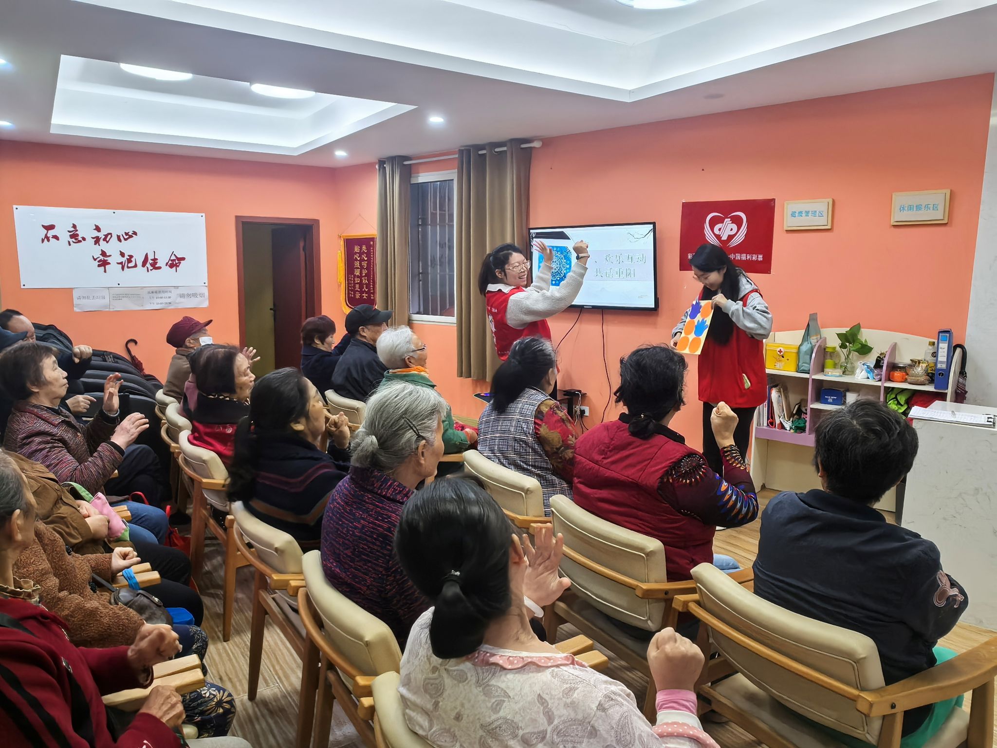 一大早,志愿者们就忙碌起来,挂横幅、摆桌椅,还在每张桌上准备了水果、点心和牛奶,把活动现场布置得像家一样温馨。他们一边热情地搀扶老人入座,一边聊着家常,房间里很快充满了轻松愉快的谈笑声。趁着这股热乎劲儿,考验反应能力的“心手相映”挑战便开场了。长者们精神抖擞、反应敏捷,展现出不减当年的活力。游戏过后,志愿者们为长者们送上了精心准备的重阳香包,每一份香包都承载着对长者们健康长寿的美好祝愿。