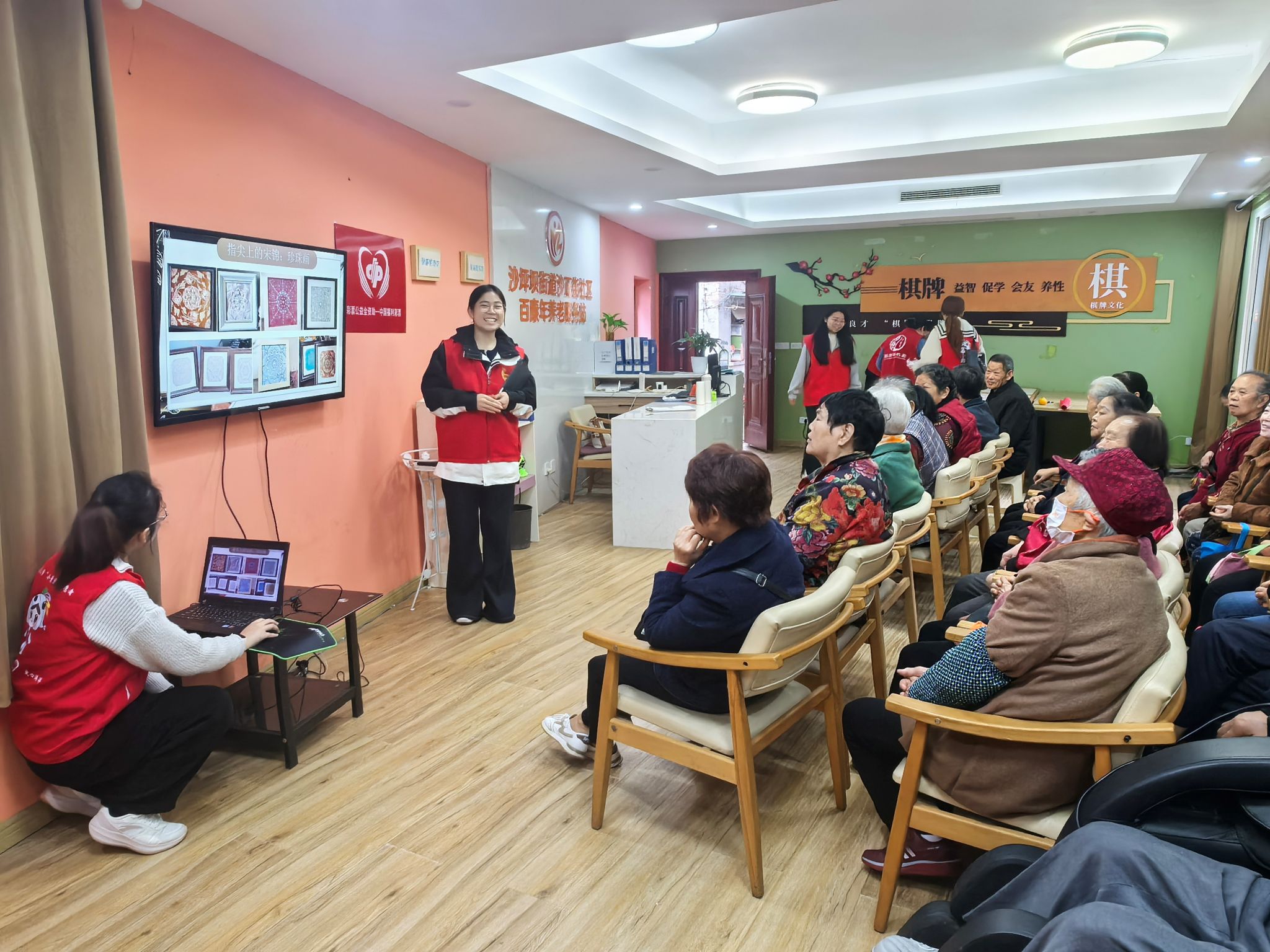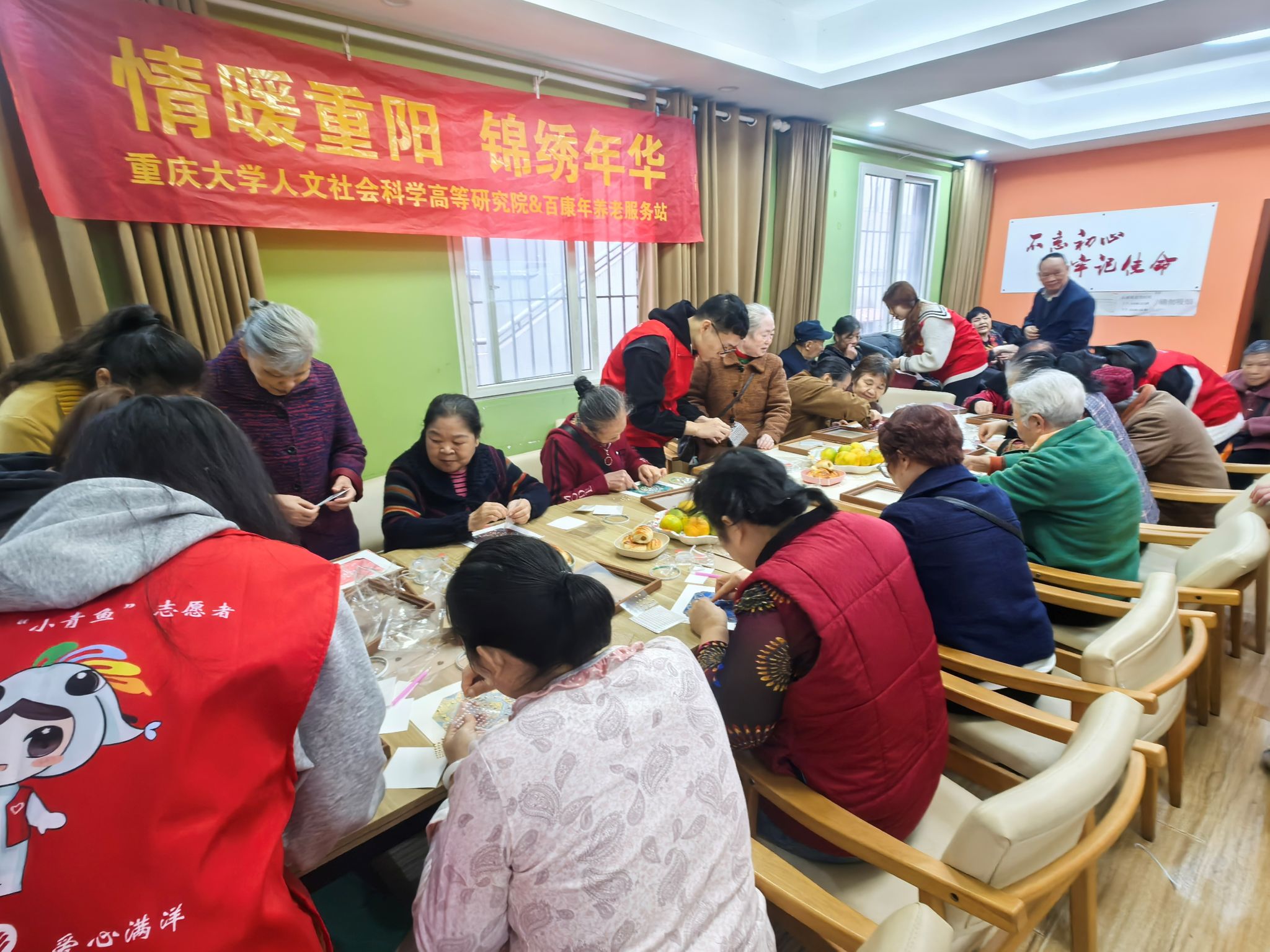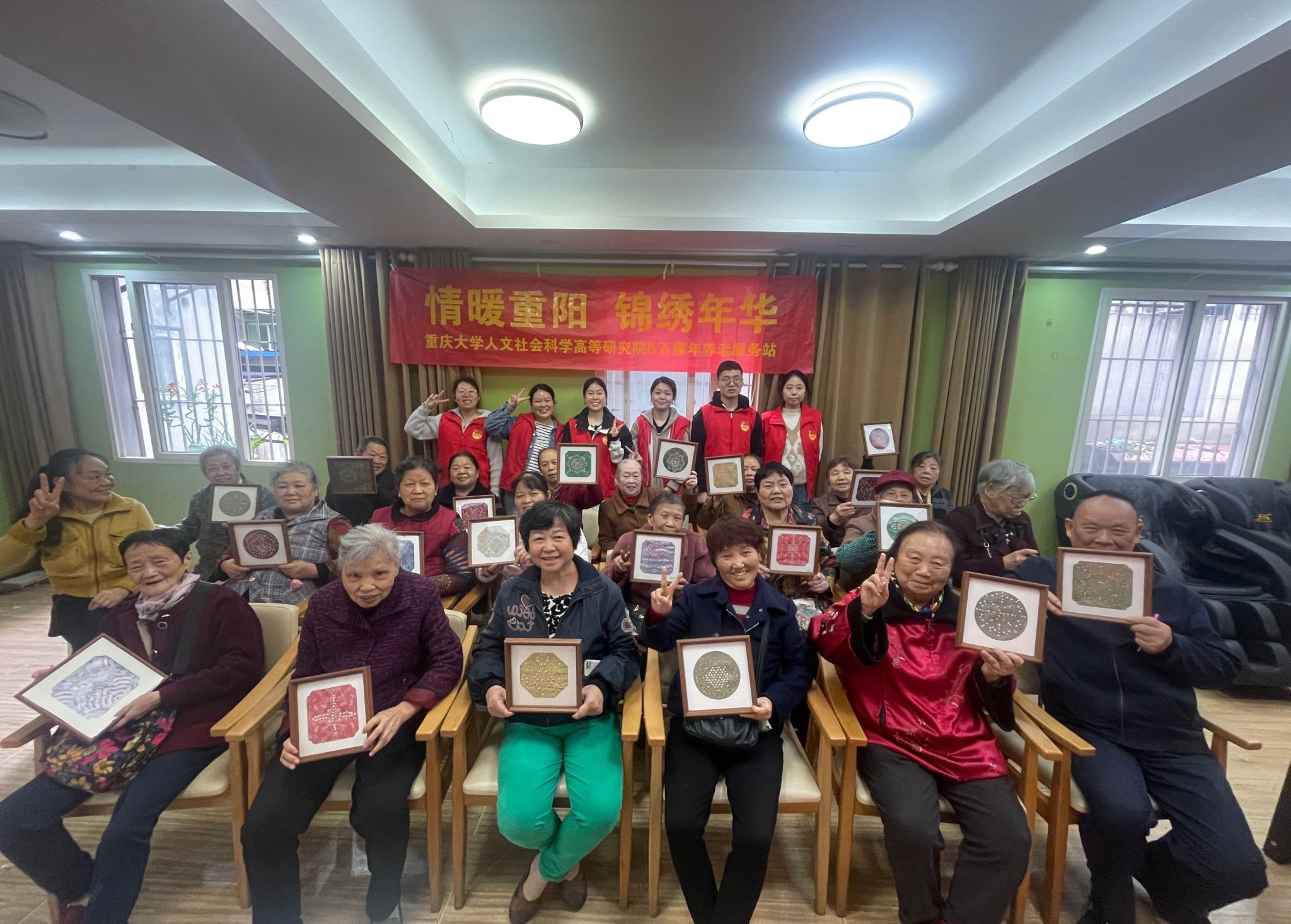 人文社会科学高等研究院爱心社的志愿者们带着满满的诚意与温暖,走进沙坪坝区百康年养老服务站,举办了一场别开生面的"情暖重阳,锦绣年华"主题敬老活动。在这个寓意深远的日子里,志愿者们以国家级非物质文化遗产——宋锦为载体,与长者们共同度过了一个充满文化底蕴与温情陪伴的美好时光。