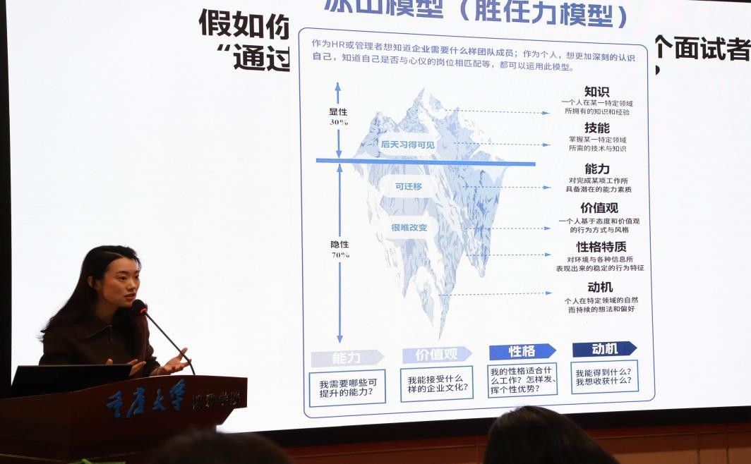 面试之要,不止于言。在面试技巧攻略篇,赵雅欣引入“冰山模型”人才评估体系,指出用人单位不仅关注显性技能,更看重冰山下的能力、价值观等核心素养,尤其强调应届生的可塑性、成长性价值。针对面试全流程,她还提供了全方位指导,比如前期需通过正规渠道深入了解企业与岗位信息,做好形象与心态双重准备,自我介绍需简洁有条理。