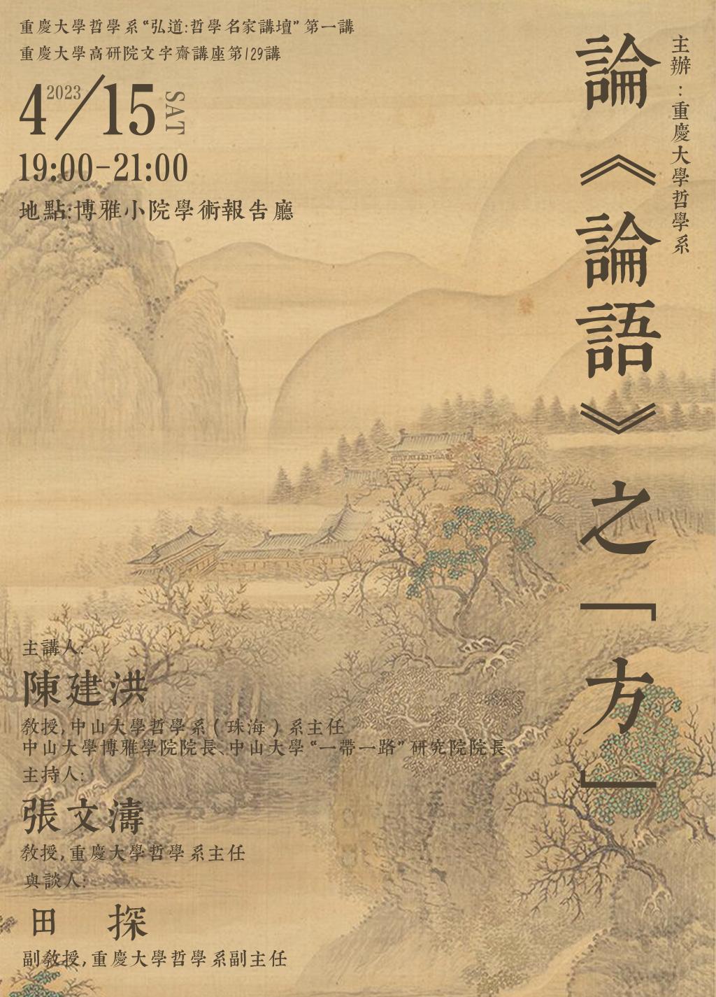 哲学系正式成立。为了增进与学术界的交流互动,得到学界前辈、同仁的指导、支持和鼓励,推动本系成长和发展,今筹办“弘道:哲学名家讲坛”系列讲座,聘请海内外学界的硕学鸿儒莅临指导、启迪后进、熏习风气。此次首场讲座,我们有幸邀请到中山大学的陈建洪教授以《论<论语>之“方”》为题担纲主讲。