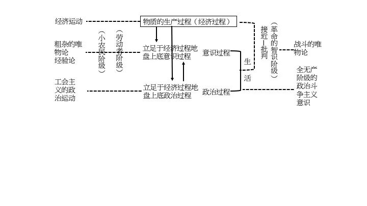 如果仅以普罗列搭利亚自身的力量,却不能超过一定的限度,即在意识过程方面,只能达到一种粗杂的唯物论或经验论,在政治过程方面,只能产生一种工会主义的政治运动。而战斗的唯物论及全无产阶级的政治斗争主义的意识,必须待革命的智识阶级的参加,而且只有从外部才能注入。这种关系,我们可以用简单的图式来表示。32