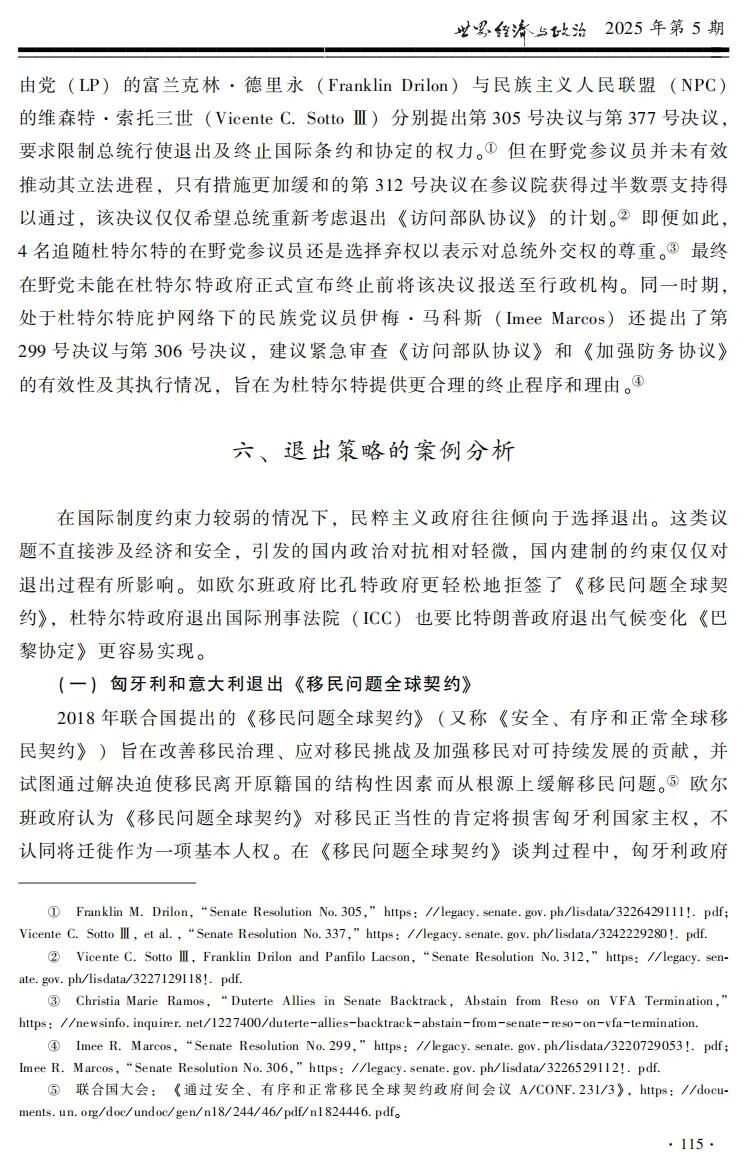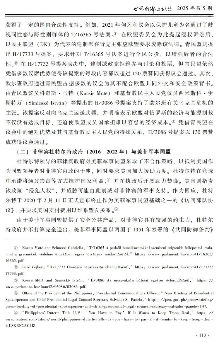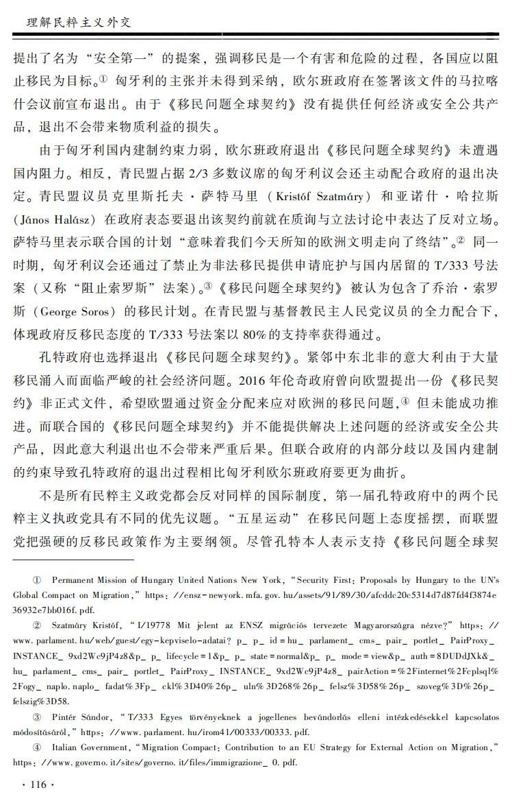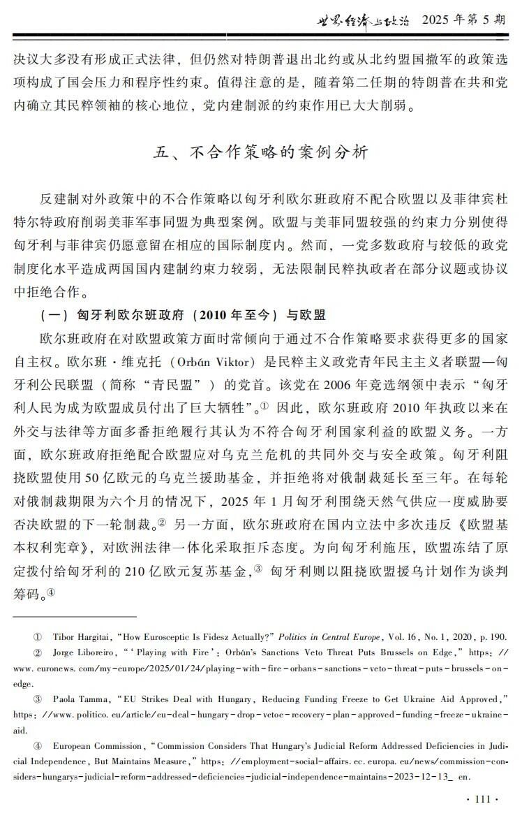 【内容提要】民粹主义外交的共同特征是挑战国内建制所支持的国际制度。民粹主义政党和领导人执政后,往往会对相应国际组织和国际机制采取讨价还价、不合作和退出三种反建制策略。策略选择的差异取决于面对的国际制度和国内建制组合。国际制度有效提供的公共产品类型决定了反建制对外政策的成本,供给经济安全类公共产品的国际制度通常比非经济安全类国际制度的约束力更强。国内建制则对反建制对外政策施以程序性约束,议会制中的联合政府往往比一党多数政府约束力更强,总统制中高制度化政党的约束力强于低制度化政党。当国际层面和国内层面的约束力都比较强时,民粹执政者倾向讨价还价,案例包括意大利孔特政府对欧盟政策和美国特朗普政府对北约政策。当国际制度约束力较强而国内建制约束力较弱时,民粹执政者可以选择不合作,案例包括匈牙利欧尔班政府对欧盟政策以及菲律宾杜特尔特政府对美菲同盟政策。对待约束力较弱的国际制度,民粹执政者往往倾向于选择退出,而国内建制影响了退出的过程:如匈牙利欧尔班政府退出《移民问题全球契约》和菲律宾杜特尔特政府退出国际刑事法院,就比意大利孔特政府退出《移民问题全球契约》和美国特朗普政府退出气候变化《巴黎协定》更容易实现。四国的八个案例展示了民粹主义三种反建制外交策略的选择机制,为理解民粹主义如何影响国际政治提供了新的视角。
