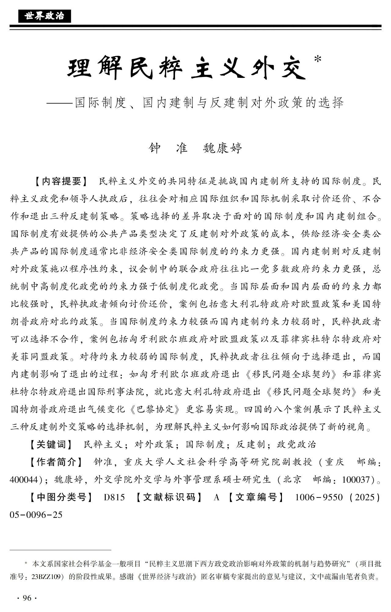 【关键词】民粹主义;对外政策;国际制度;反建制;政党政治