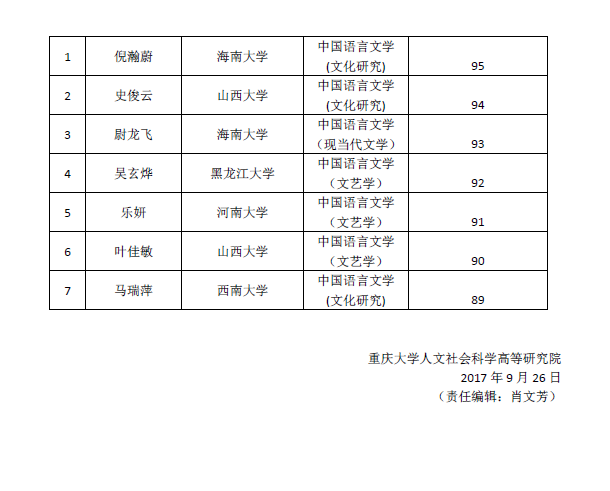 根据重大校研【2017】36号文件通知要求和《情色av 人文社会科学高等研究院关于接收2018年推荐免试攻读硕士研究生工作细则》,情色av 接收2018年校外推免生复试成绩公示如下。公示期为三天,公示期内如有异议,请向情色av 接收推免生工作领导小组提出书面异议。