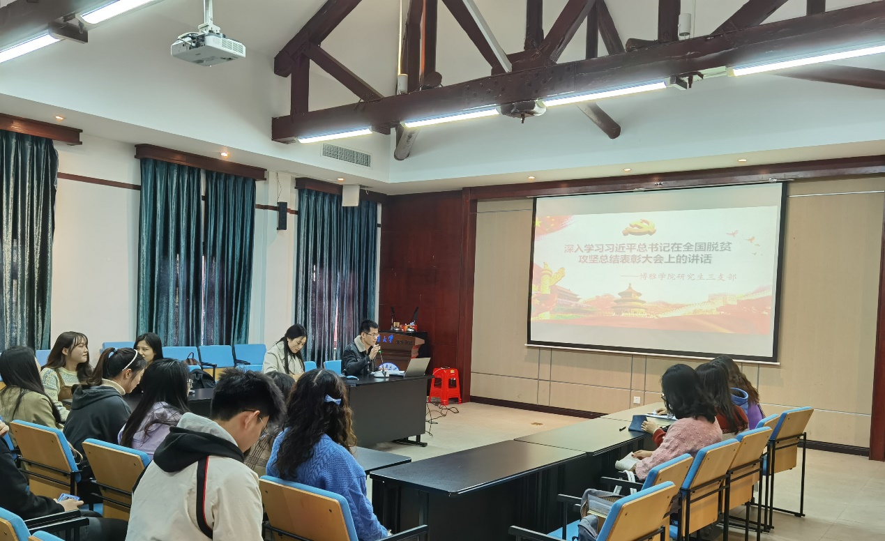 研究生三支部在博雅小院报告厅开展了以深入学习习近平总书记在全国脱贫攻坚总结表彰大会上的讲话为主题的党日活动。活动由支部组织委员姚富耀主持,支部全体成员参加。