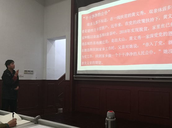 随后赵振豪同学又介绍了扶贫书记黄秀华的先进事迹。黄文秀,作为一位广西的贫困山区的第一书记,一位从事于脱贫攻坚第一线的好干部,怀着“我想回去建设家乡,把希望带给更多父老乡亲”的念想,一头钻进贫困人民中去,在近距离中感受群众疾苦,在走村入户中了解群众所需所盼,在埋头苦干、无私奉献中带领88户418名贫困群众脱贫。但在2019年6月16日晚,她在回村部署抗洪的途中遭遇山洪,不幸牺牲。通过赵振豪同学详实的讲解,支部成员进一步认识到了共产党员的使命和初心,纷纷表示要以实际行动,发挥共产党员的带头作用。