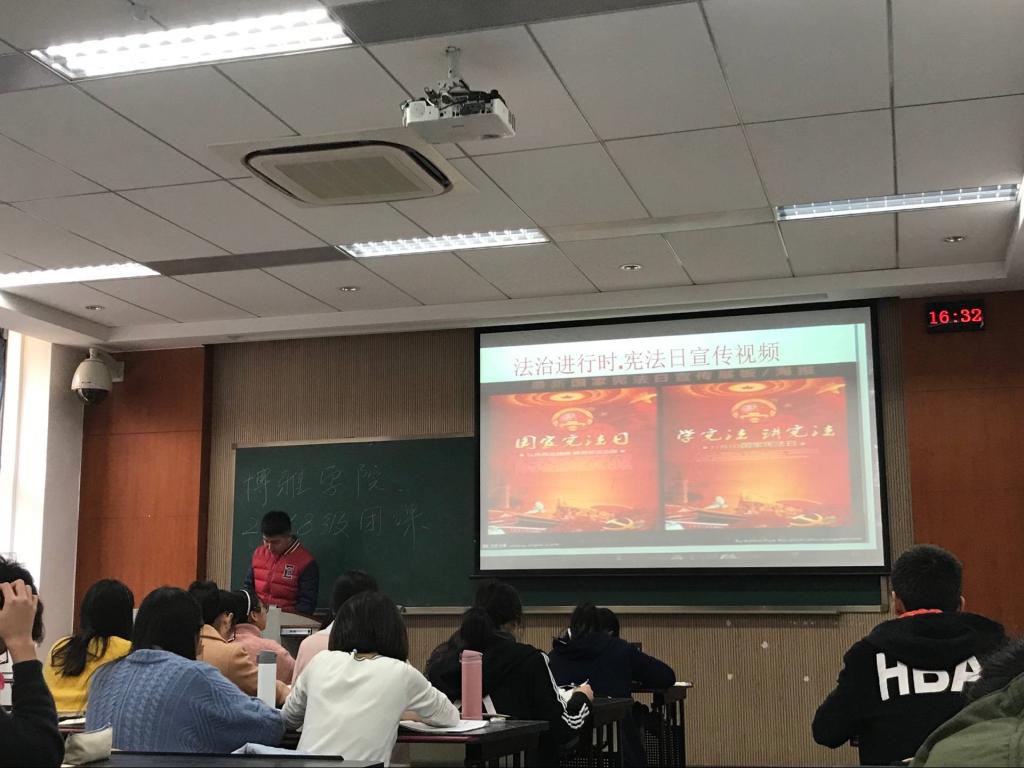 刘吉千同学介绍本次团课的主题——“增强宪法意识,提升法律素养”和本次团课的主要环节,同学们表现出很大的兴趣。他从1949年颁布的《中国人民政治协商会议共同纲领》这一临时宪法开始,依次介绍了五四宪法、七五宪法、七八宪法以及我国现行宪法——八二宪法,这些我国宪法发展史上的重要宪法版本。为了使大家对宪法、法治有更深刻和更切身的认识,同学们一起认真观看了《法治进行时》栏目的宪法日主题报道《我们是中国人》。