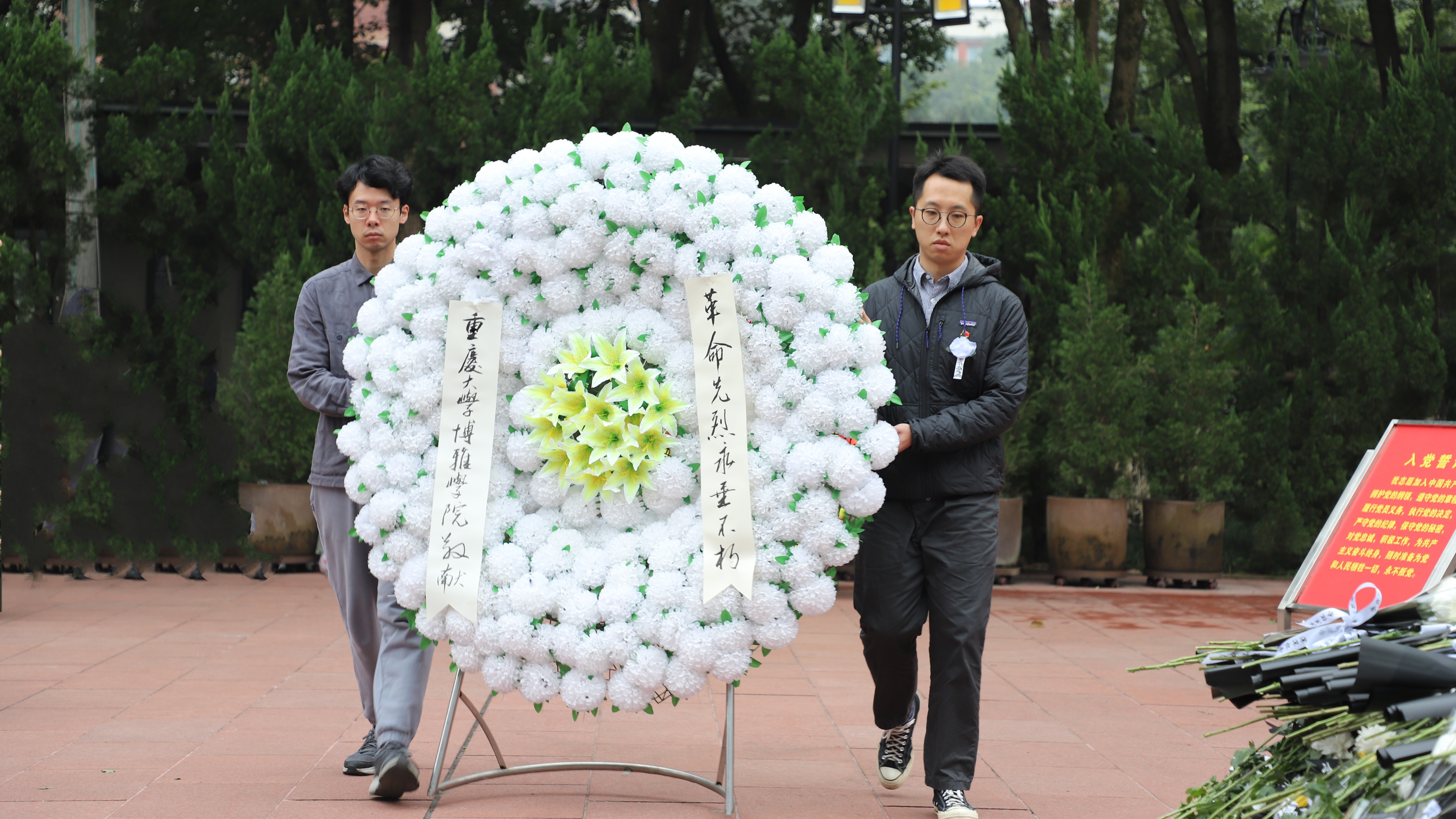 “巍巍歌乐山,铮铮红岩魂”,在工作人员主持下,开始了悼念仪式。全体党员整齐有序地站在死难烈士墓前,神色庄重肃穆。由学院教师党员代表向烈士们敬献花圈,全体党员集体肃立默哀。