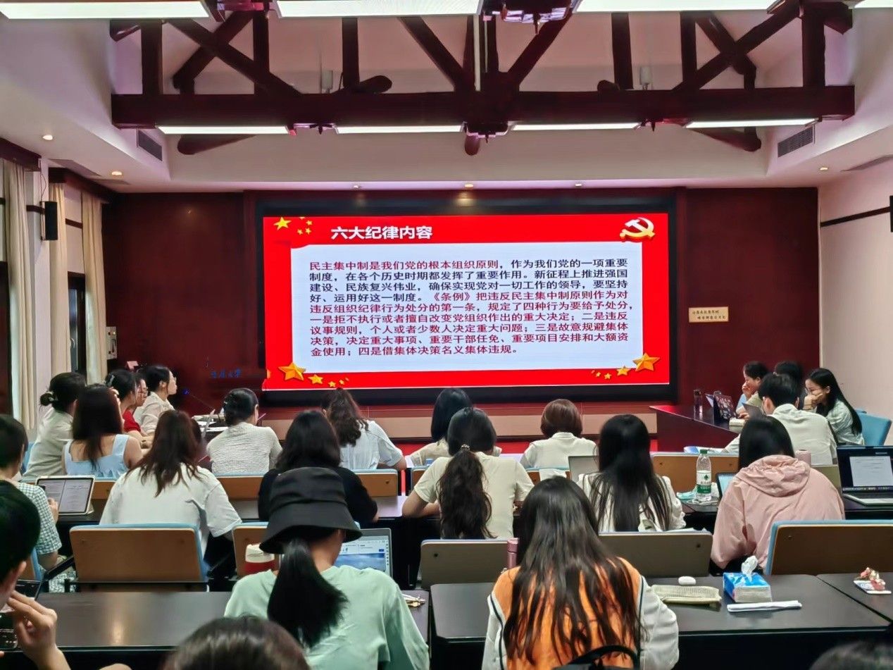 随后,支部书记郑家勤老师为大家讲授了党纪专题党课。作为广大党员普遍遵守的行为规则,党的纪律始终与党的事业相伴随,并随着党的事业发展而变化、完善、规范。以习近平总书记关于党的纪律建设的重要论述开篇,郑家勤老师分别从党的政治纪律、组织纪律、廉洁纪律、群众纪律、工作纪律、生活纪律的重要意义与相关规定进行讲解,并列举《中国共产党纪律处分条例》中的具体条文为例进行阐发。党员同志们在学习中深刻认识到,党纪不仅是对党员同志的警示和约束,也是对我们的帮助和保护,党纪是党员干部最坚强的后盾。