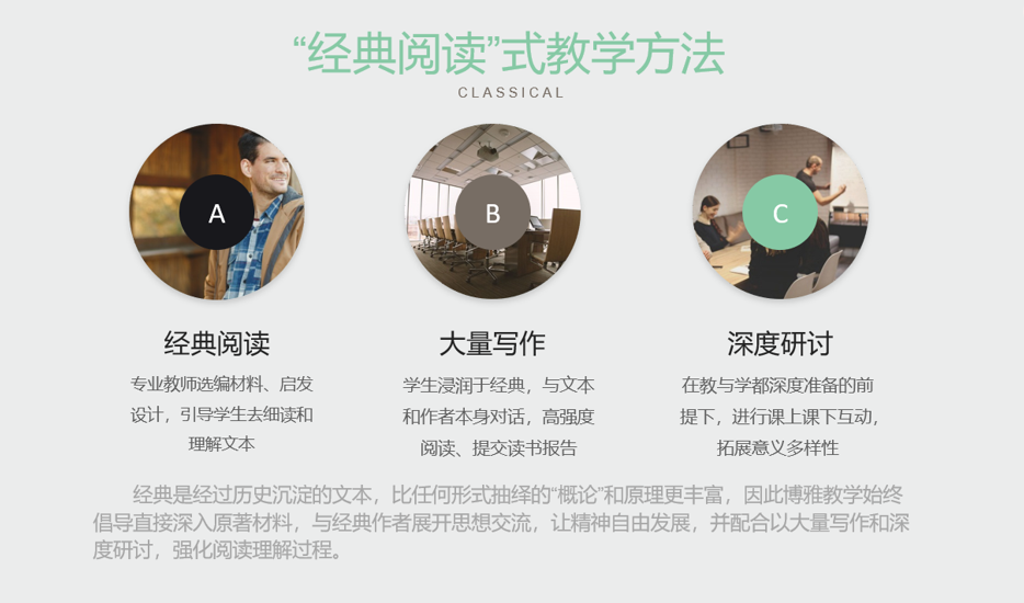 “经典阅读”式教学方法。博雅倡导直接阅读经典原著,教师引领学生深入文本语境,理解中外文明内涵、把握基础文科的基本问题与方法;辅之以深度研讨与大量写作,强化教学过程,深度互动,提升教学质量与学习体验。