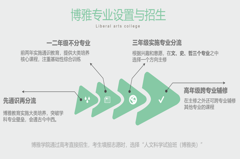 “先通识再分流”的学制。博雅本科学制四年,其中一、二年级实施不分专业的通识教育,提供大类培养核心课程,注重基础性综合训练;三四年级实施专业分流,在文、史、哲三个专业之中选择一个方向主修。优秀的博雅学子将有机会获得推荐免试攻读硕士学位资格。