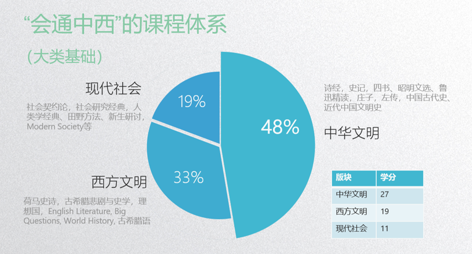 “会通中西”的课程体系。一、二年级大类培养核心课程涵盖“中华文明”、“西方文明”和“现代社会”三大板块;三、四年级分流之后提供文、史、哲三个方向的专业必修与选修课。