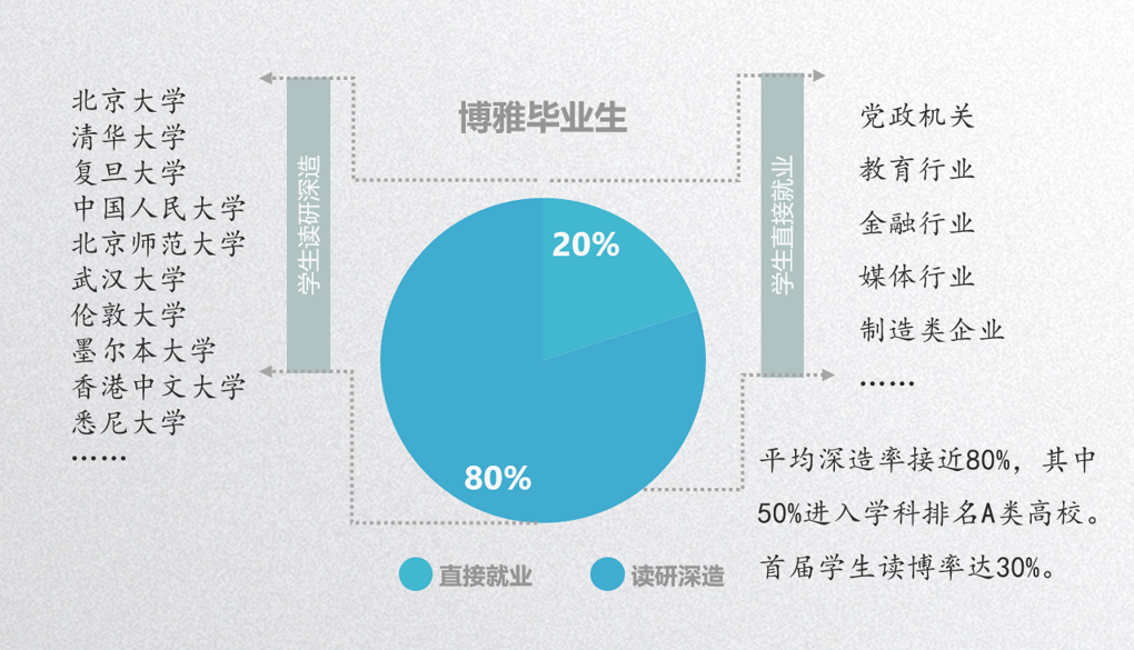 已有2017~2022届共六届毕业生,大多数学生选择进一步攻读硕士学位。截止目前,前六届学生的综合深造比率接近80%,升学的学校包括北京大学、清华大学、中国人民大学、复旦大学、北京师范大学、南京大学、伦敦大学、香港中文大学、芝加哥大学等境内外著名高校。