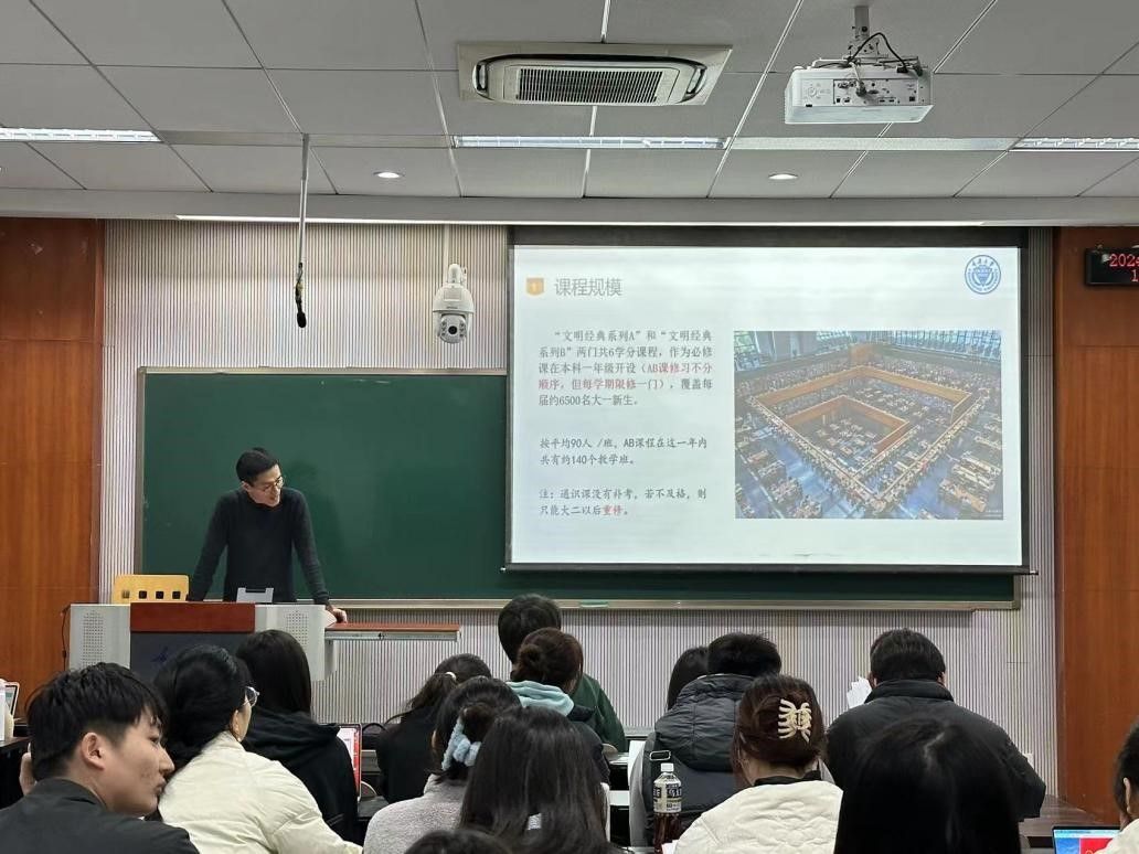 全体大一新生的通识核心课程,文明经典课程以“文明以止、立德树人”为理念,采取“大班授课、小班研讨、大量写作”的方式,帮助学生理解中外经典文本的内涵,培养学生文献阅读、沟通交流、说理写作等多方面的能力。为促进课程目标与效果的实现,该课程实施助理讲师制度,助理讲师既是教师授课的“课程助理”、也是学生学习的“良师益友”。助理讲师需要协助主讲教师做好全过程教学工作,对课程的顺利开展起到了重要作用。沈秋老师指出,助理讲师的岗位职责涉及多个方面,包括组织和主持讨论班、批阅学生的读书报告、随堂听课并维持课堂秩序等,需要每一位助理讲师认真对待。此外,沈秋老师重申了助理讲师的考核机制与奖惩机制,希望大家端正工作态度、落实岗位职责,为保障课程顺利进行而努力。