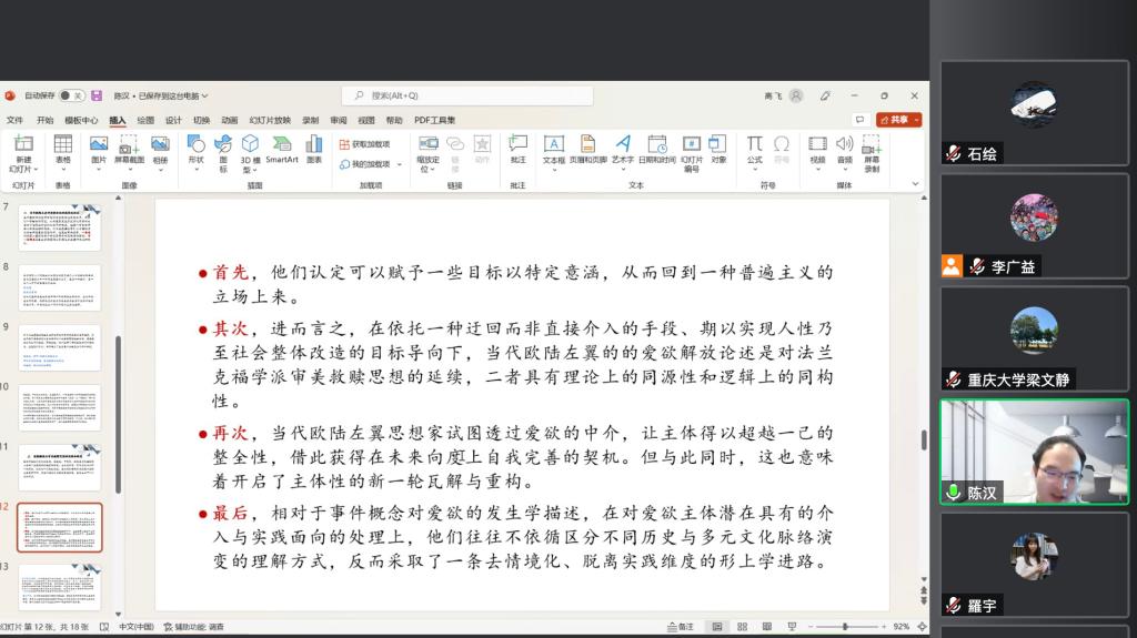 12月8日,中文系学术沙龙在线上顺利举行,“博士论文奖学金”访问学者、武汉大学文学院博士候选人陈汉做了学术报告。