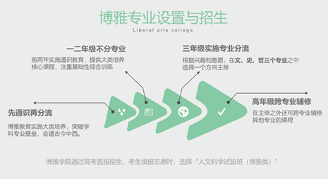 The Liberal Arts (Boya) College adopts a curriculum that offers general education before major-based training. Its four-year undergraduate program consists of two parts: the first two years are devoted to general education, when students take mandatory core courses which aim to give them a solid foundation in the humanities disciplines; in their third and fourth years, students choose to major in one of the three disciplines—literature, history, or philosophy. Outstanding Boya students will have the opportunity to be recommended to pursue a master’s degree without examination.